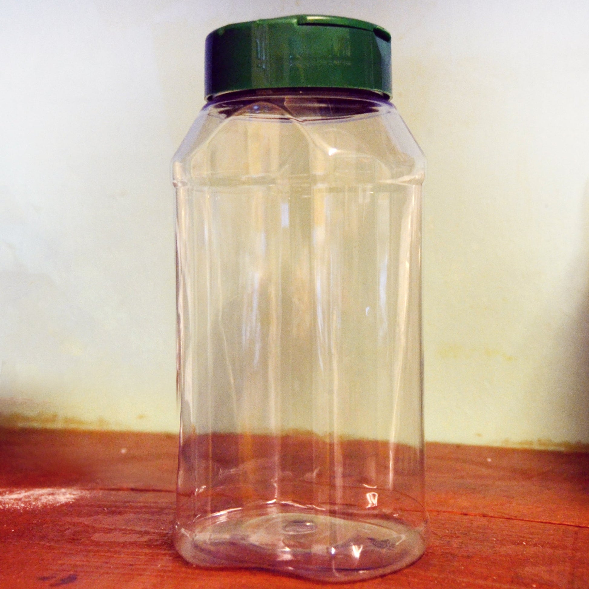 Kätevä iso muovipurkki kannella, jossa sekä sirotin- että lusikkapuoli